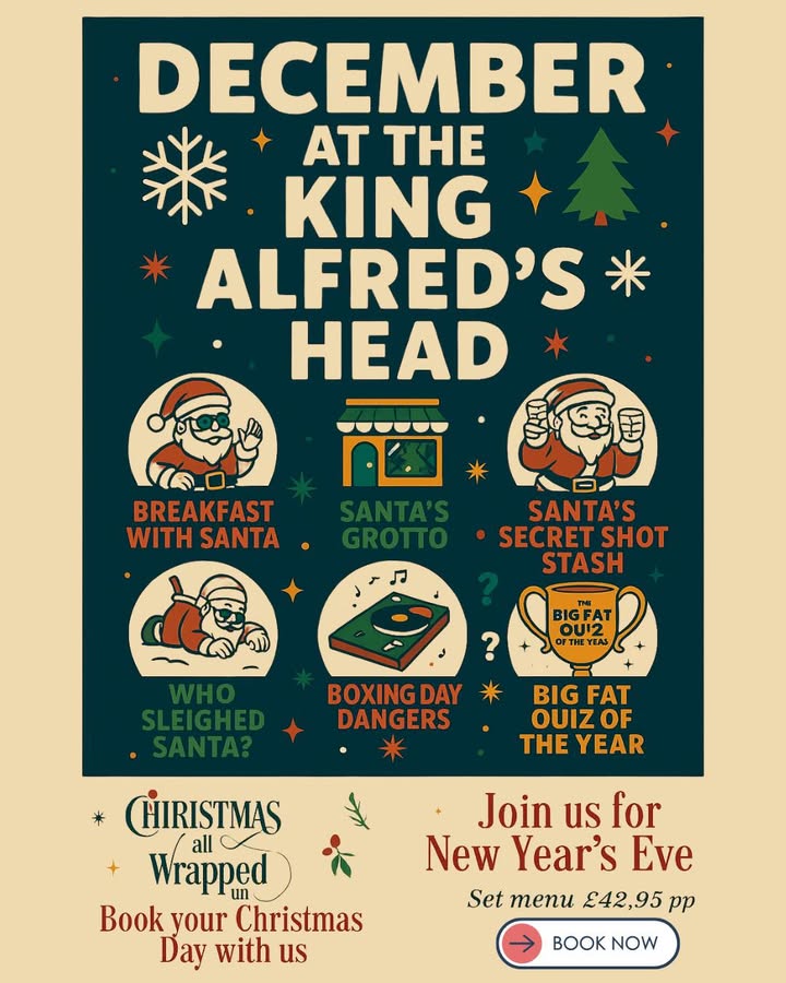 ✨🎄 YOUR FESTIVE HQ THIS DECEMBER! We’re going big this Christmas at The King Alfred’s Head — quizzes, raffles, DJ nights, Santa events, live music, festive food, and loads of surprises. Join us throughout December for cosy magic, big laughs & unforgettable nights! 🎅🍻❄️