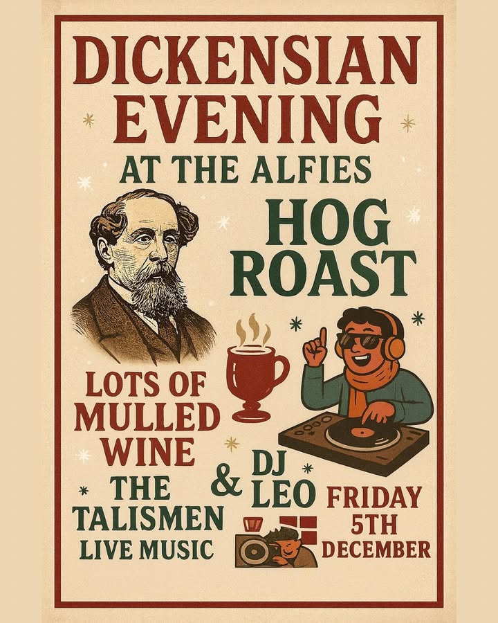 Step back in time for Dickensian Evening at The Alfies! 🎄✨ Hog roast, loads of mulled wine, live music from The Talismen, and DJ Leo to finish the night in style. A magical festive evening you won’t wanna miss! 🎶🔥